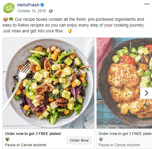 Ecco un ottimo esempio di annuncio carosello su Facebook di HelloFresh: