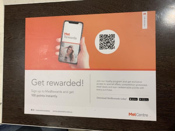 #7. Partecipa a un programma a premi : convincere le persone ad accedere a un sito Web e a partecipare al tuo programma a premi può essere una grande sfida per i negozi fisici. I codici QR aiutano ad aumentare il numero di persone che aderiscono al tuo programma a premi. Ad esempio, questo centro commerciale ha un grande codice QR con accesso al loro programma a premi su tutti i tavoli della sala da pranzo: