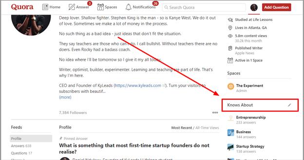 Un'altra sezione del tuo profilo Quora dovrebbe essere ottimizzata. Questo potrebbe non migliorare le tue conversioni, ma ti rende più facile essere scoperto. Nella pagina del tuo profilo, cerca un'area chiamata "sapere" a destra dello schermo.