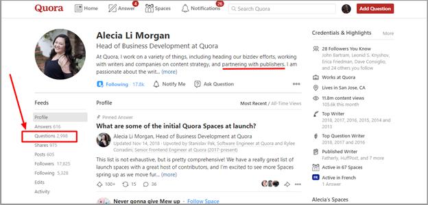 Inizia con il tuo profilo, quindi passa a trovare le domande e gli argomenti giusti. Dopodiché, concentrati sulla risposta alle domande in un modo che induca le persone a fare clic e leggere.
