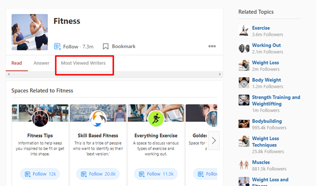 Guarda a sinistra dello schermo e fai clic sull'opzione di menu denominata "argomenti". Ti mostrerà tutti gli argomenti relativi al fitness e il numero di follower che ha. Apri tutti quelli rilevanti in una nuova scheda.