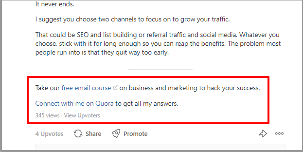 Per far crescere rapidamente i tuoi follower, aggiungi due CTA alla fine delle tue risposte. Uno incoraggerà le persone a seguirti su Quora e l'altro indirizzerà le persone a una pagina di destinazione specifica sul tuo sito web.