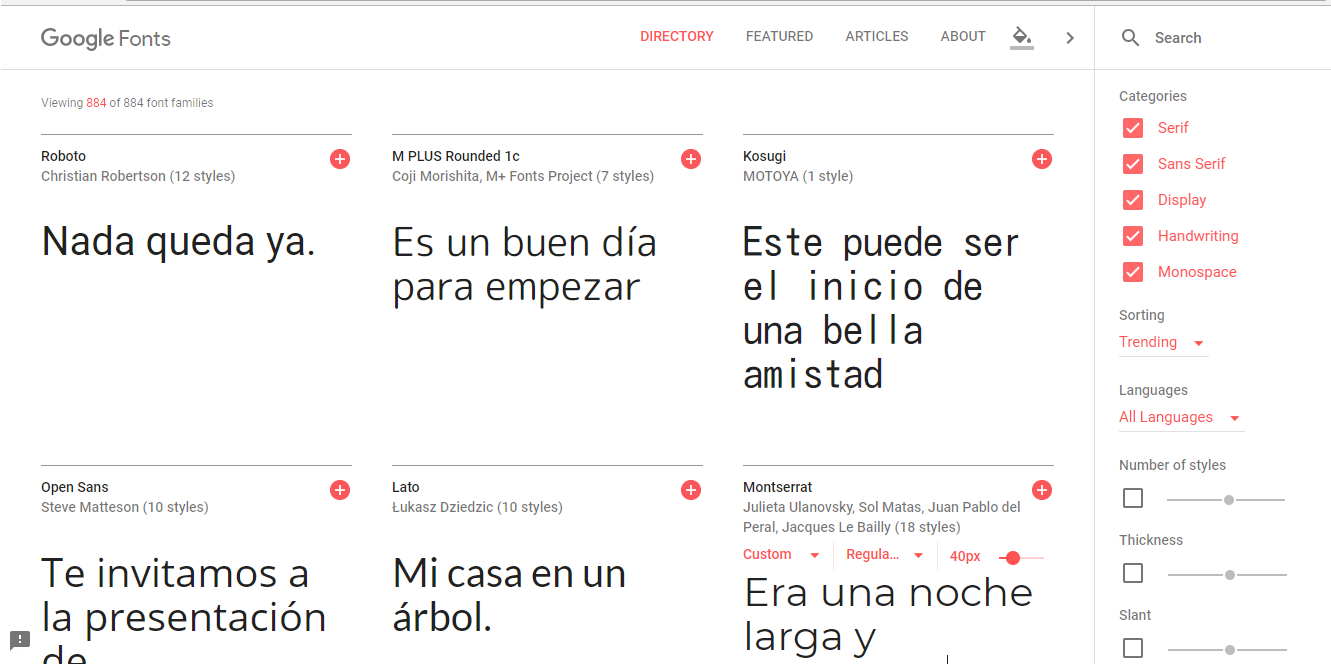 Google nos ofrece esta galeria con distinti tipi di fuentes gratuitis para utilizar en tus disenos. Solo debes encontrar la tipografia que mas te gusta y guardar las fuentes en tu coleccion.