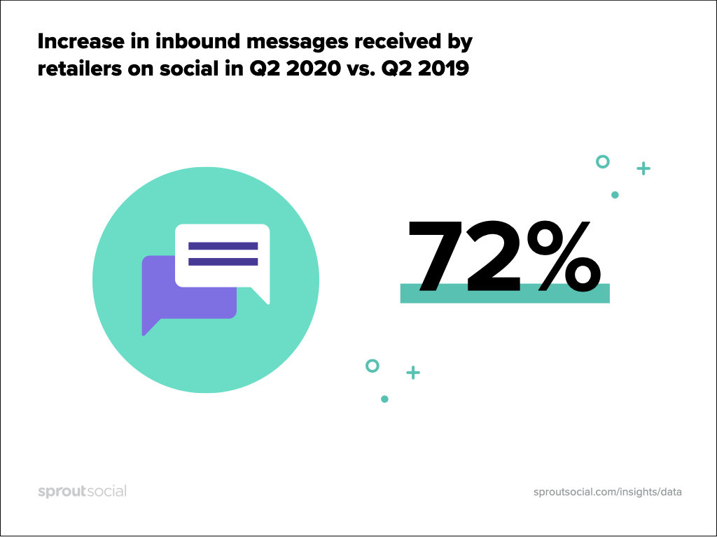 Secondo i dati Sprout, da aprile a giugno i rivenditori hanno registrato un aumento del 72% del numero medio di messaggi in entrata giornalieri ricevuti rispetto allo stesso periodo dell'anno scorso. In altre parole, i clienti si rivolgono maggiormente ai marchi sui social mentre si adattano alle nuove esperienze di acquisto.