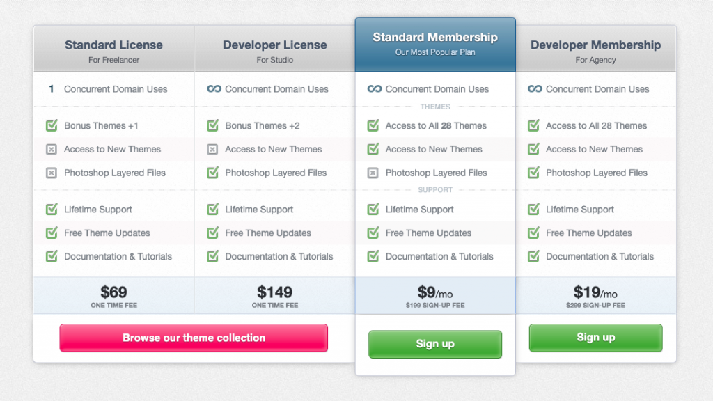 Alcuni anni fa era piuttosto semplice vendere i pacchetti a tema al prezzo di $ 199. Per ottenere gli stessi risultati al giorno d'oggi, abbiamo dovuto introdurre diversi livelli di prezzo a partire da quello base di $ 99. Ciò è principalmente influenzato dalla forte concorrenza con i mercati che hanno una grande varietà di temi multiuso a un prezzo molto basso, ma anche dal cliente medio che non è realmente interessato a spendere più di $ 99 per un tema per il suo sito web.