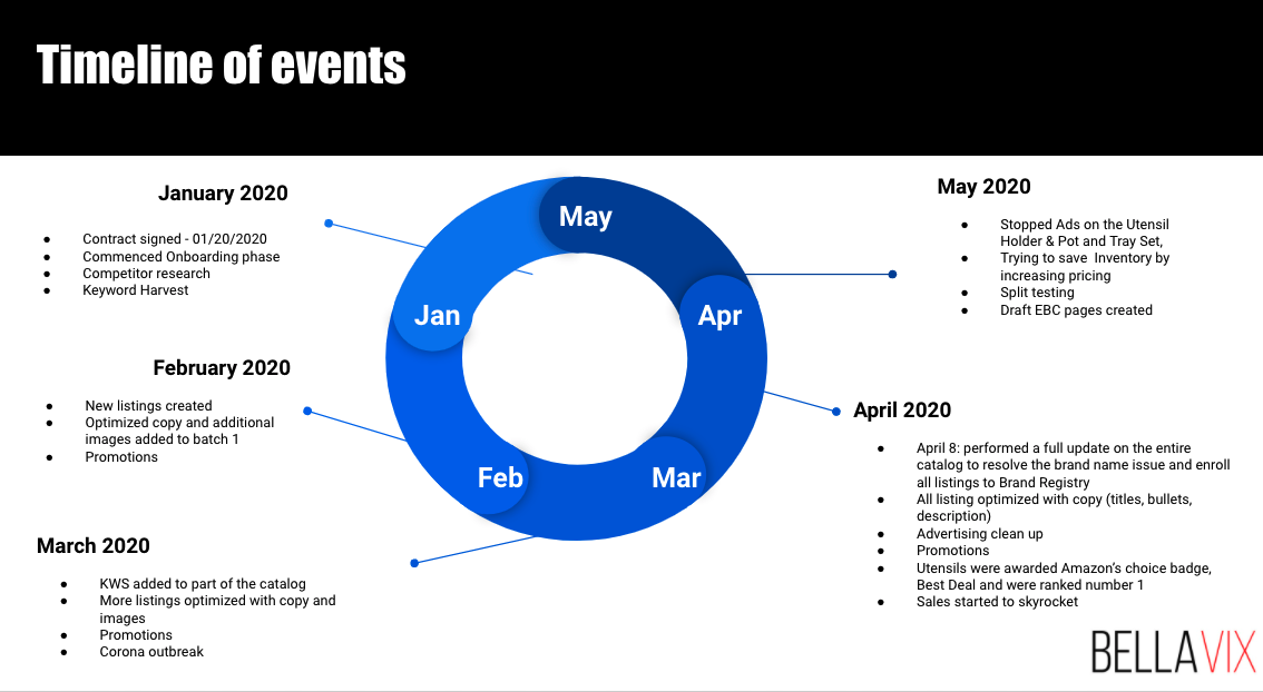 Di seguito è riportata una sequenza temporale degli eventi da quando abbiamo rilevato l'account e iniziato a lavorare insieme.
