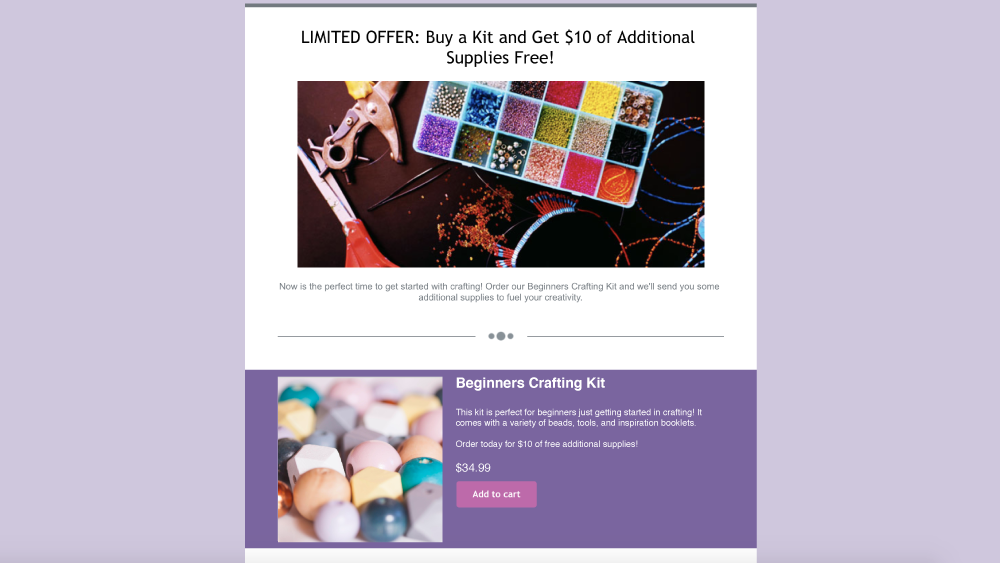 Per quel secondo componente, puoi inserire un annuncio sui social media o su Google, pubblicare in modo organico su uno qualsiasi dei tuoi account di social media, oppure puoi semplicemente inviare un'e-mail al tuo elenco di iscritti (o a un segmento mirato del tuo elenco di iscritti).