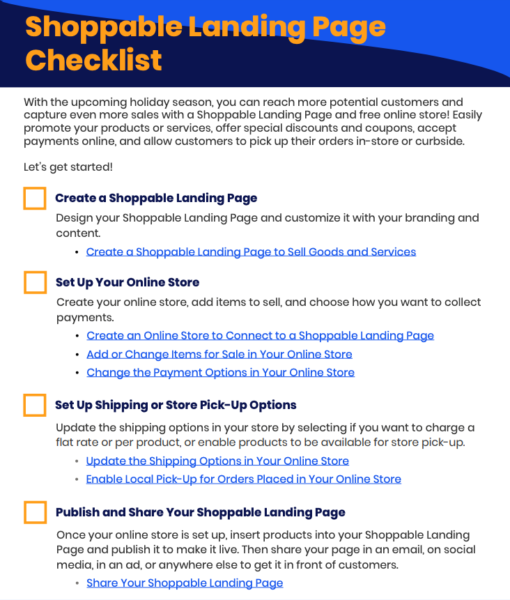 Fai clic sull'immagine qui sotto per scaricare la nostra lista di controllo delle pagine di destinazione acquistabili e iniziare a vendere online! L'elenco di controllo ti mostrerà quali passaggi devi eseguire ora per iniziare, con collegamenti a tutorial facili da seguire per ogni passaggio.