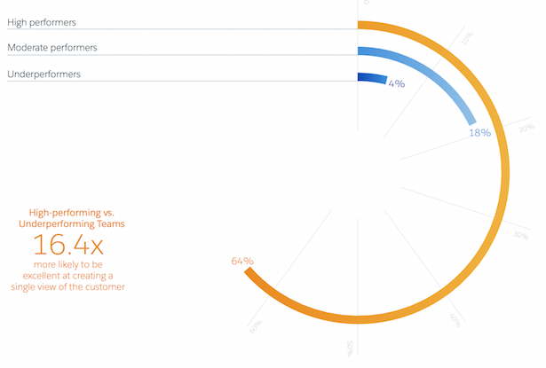 - Vista cliente singolo: non può esistere un'esperienza multicanale o qualsiasi tipo di esecuzione dinamica senza un'unica vista del cliente. O dovrei dire, non ci può essere un'esecuzione best in class. Gli high performer hanno 13,7 volte più probabilità di essere in grado di creare un'unica visione del cliente rispetto ai underperformer.