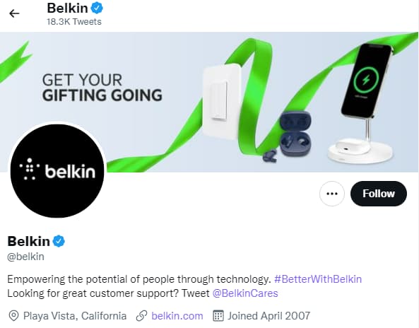 Vediamo aziende come Belkin che utilizzano questo approccio. Il marchio di elettronica di consumo avvisa gli utenti di porre domande utilizzando il suo canale di assistenza clienti Twitter dedicato.