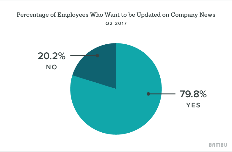 Il vantaggio collaterale di avere un ottimo programma di comunicazione interna è che puoi condividere importanti post sui social con il team. La difesa dei dipendenti amplificherà solo il contenuto che pubblichi. In uno studio condotto da Bambu, il 79,8% dei dipendenti desidera essere aggiornato sulle novità aziendali. Come mai? Sapere cosa sta succedendo in azienda può aiutarli a svolgere meglio il proprio lavoro e aiutarli a comunicare le buone notizie agli altri al di fuori dell'azienda.