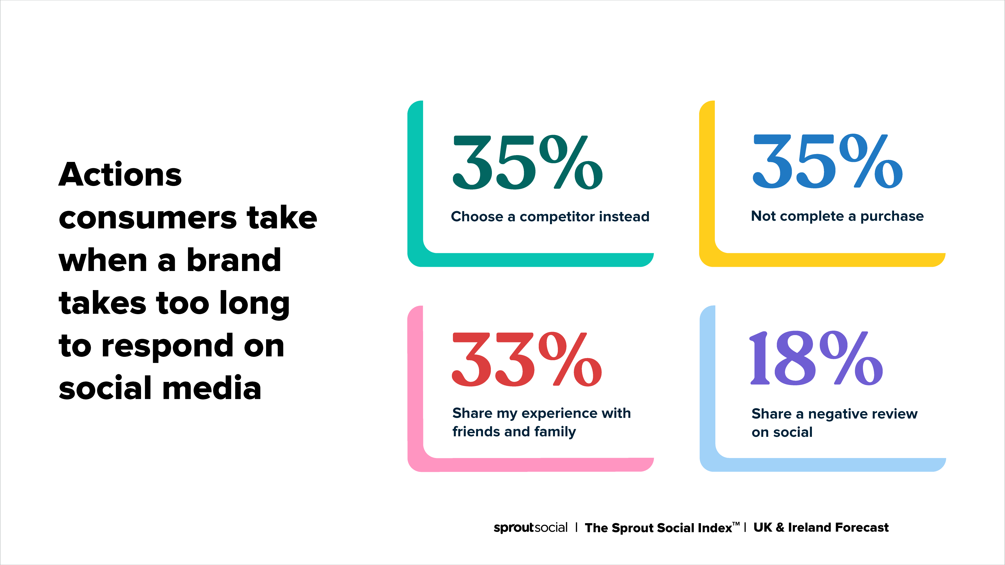 Usa la ricerca di settore per informare su come il tuo marchio naviga sui social media in Europa. Per aiutarti, abbiamo raccolto alcune statistiche dallo Sprout Social Index 2022: edizione per Regno Unito e Irlanda, insieme ad altri fatti specifici del mercato per aiutare a definire la tua strategia.
