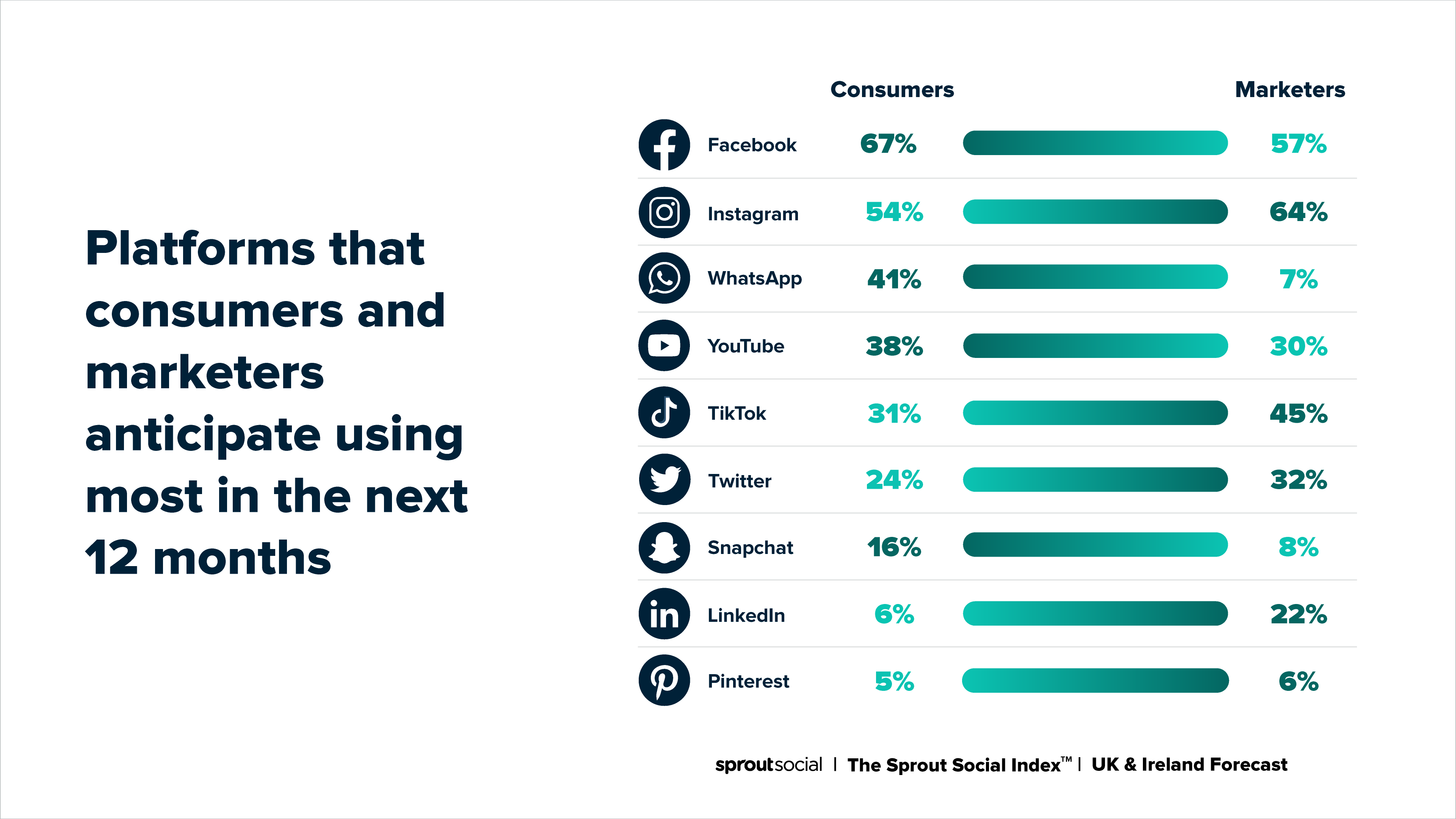 5. Circa il 67% dei consumatori britannici e irlandesi prevede di utilizzare maggiormente Facebook di Meta nei prossimi 12 mesi e anche il 57% dei marketer prevede di farlo.
