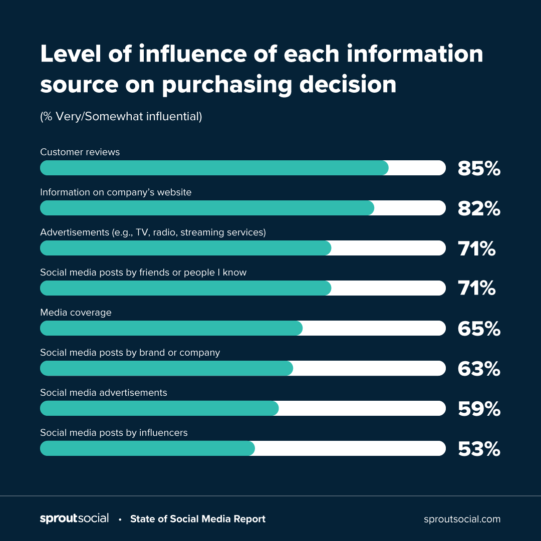 Puoi vedere che mentre il tuo sito web potrebbe sembrare l'ovvio punto di partenza per la ricerca dei clienti, leggere le recensioni di altri clienti è stata la fonte di informazioni più influente sulla tua attività (85%). Allo stesso modo, i post sui social media delle persone nella rete del consumatore si classificano in alto (71%), così come gli annunci sui social media (59%), i consigli degli influencer (53%) e i contenuti che pubblichi come azienda (63%).