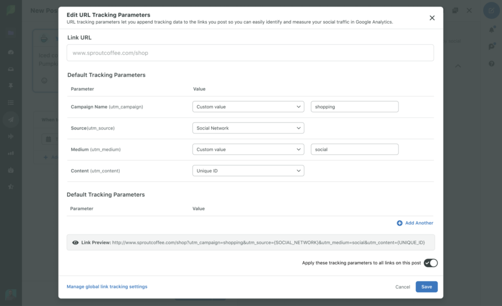 Utilizza il nostro UTM Builder per creare i tuoi link tracciabili: "Social" è solitamente la sorgente/mezzo che monitorerai, quindi viene suddiviso per rete.