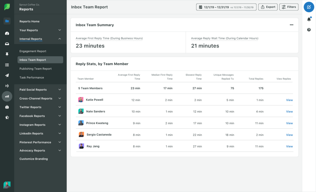Il modo migliore per quantificare questa metrica è con uno strumento. Ad esempio, i report interni di Sprout, come il report del team di posta in arrivo, calcolano per te metriche sulle prestazioni del team come il tempo medio di risposta.