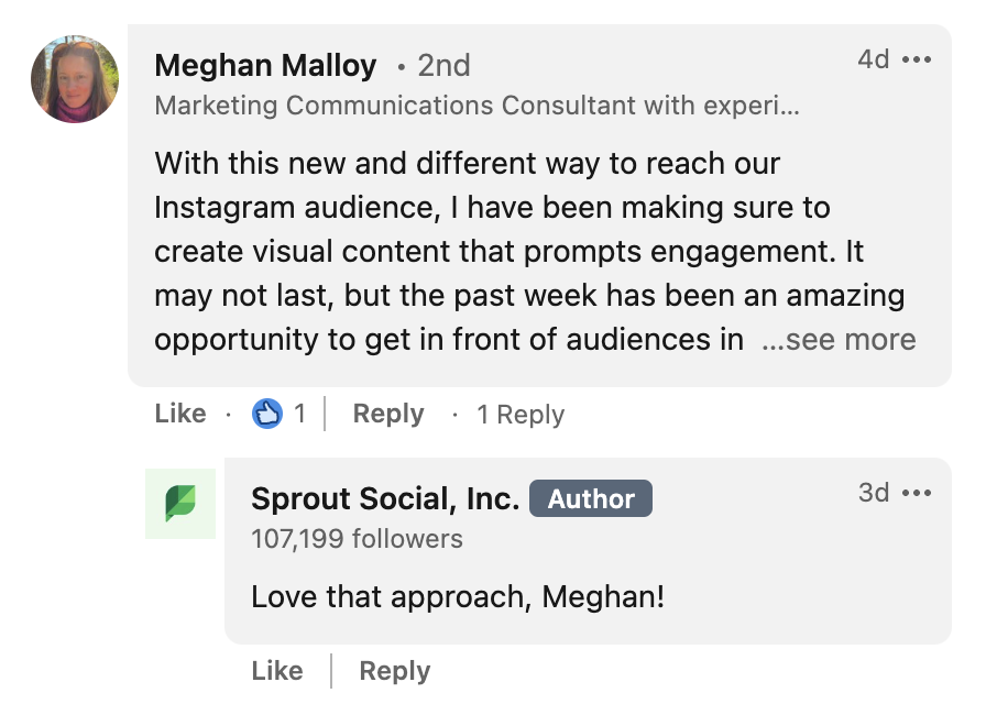 Sebbene questa sia anche una metrica di coinvolgimento, ciò che le persone dicono nei commenti fornisce informazioni preziose su di loro e sul tuo marchio. La sezione dei commenti è un ottimo posto per scoprire opportunità per migliorare l'esperienza del cliente.