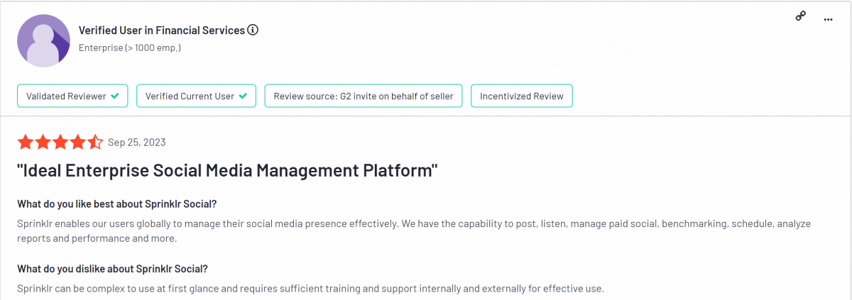 Sprinklr fornisce un ampio supporto su siti/lingue globali con funzionalità avanzate, tra cui l'intelligenza artificiale e le campagne distribuite, ma la sua ripida curva di apprendimento e la mancanza di piani self-service a prezzi inferiori mettono questa opzione fuori dalla portata di molti team di marketing sociale.