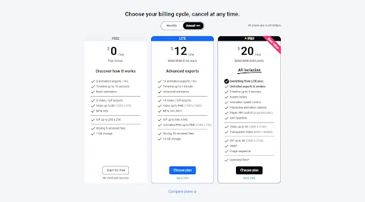 Opzioni di esportazione multipiattaforma : le opzioni di esportazione multipiattaforma includono .svg per il Web (solo CSS o incluso Java Script), .dart, .js per dispositivi mobili (Flutter/React Native per iOS e Android), video (MP4, AVI , MOV, WebM e MKV), formati di immagini animate, come GIF e PNG animati, solo per citare i più diffusi.