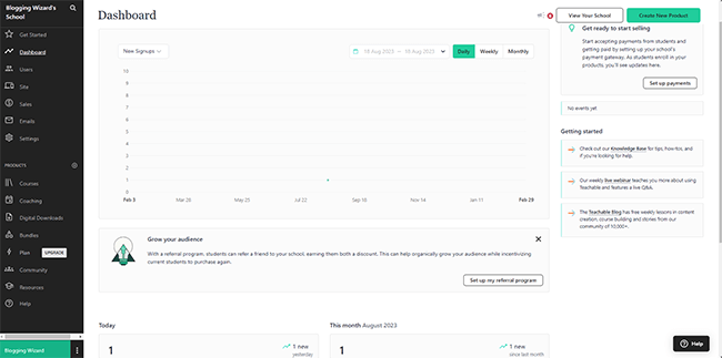 Successivamente, ti mostreremo come funziona la piattaforma Teachable. Mentre lo percorriamo, toccheremo la maggior parte di queste funzionalità. Immergiamoci dentro.