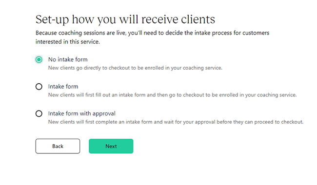 Hai la possibilità di inviare i clienti direttamente alla cassa per l'iscrizione al tuo servizio di coaching. In alternativa, puoi richiedere loro di compilare un modulo di adesione prima di pagare (e, facoltativamente, attendere la tua approvazione prima di poter completare il pagamento).