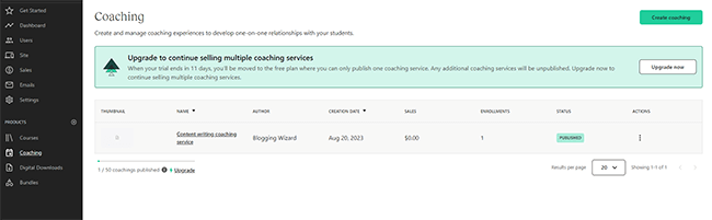 Per iniziare, fai clic su Coaching nella barra laterale della dashboard principale. Quindi, fai clic su Crea coaching e dai un nome al tuo prodotto di coaching.