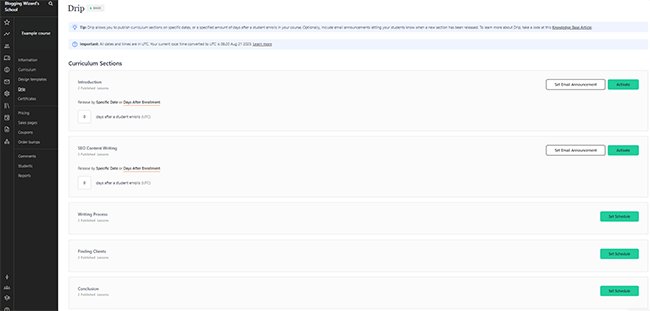 Per iniziare, torna al generatore di corsi e fai clic sulla scheda Drip . Quindi, fai clic su Imposta pianificazione accanto a una qualsiasi delle tue sezioni e specifica quando vuoi che venga pubblicata (ad esempio, 7 giorni dopo l'iscrizione dello studente).
