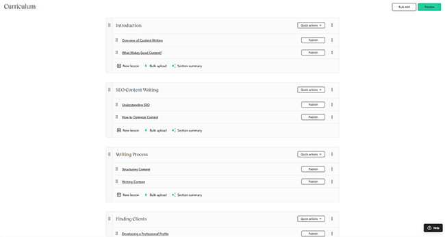Come puoi vedere, i programmi dei corsi in Teachable sono suddivisi in sezioni (moduli/capitoli più grandi) e lezioni . Ogni sezione può contenere più lezioni e il tuo corso può contenere tutte le sezioni che ritieni opportune.