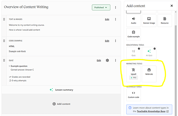 Puoi anche far emergere i tuoi upsell e i tuoi referral nelle lezioni del corso tramite i blocchi dello strumento di marketing .