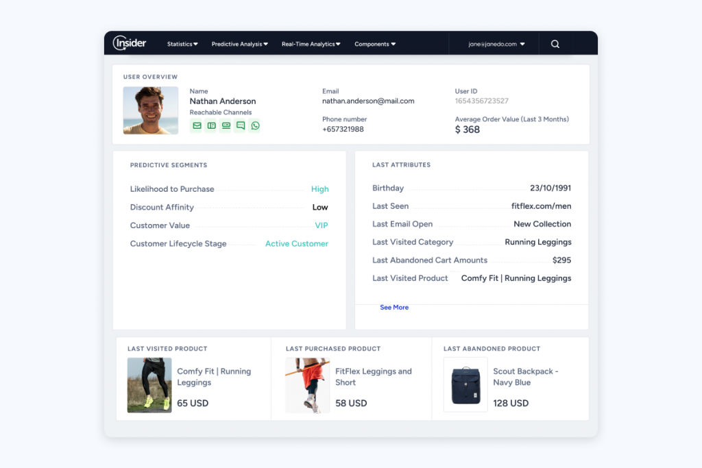 Con l'aiuto degli esperti di implementazione di Insider, Adidas e SRG hanno unificato i dati provenienti dall'intero stack tecnologico nell'intuitivo CDP di Insider. Ciò significava che potevano tenere traccia di ogni azione del cliente durante l'intero ciclo di vita in un unico posto. Con i dati unificati di zero, prima e terza parte, entrambi i marchi potrebbero creare profili cliente completi e ottenere l'accesso a una visione a 360 gradi dei propri clienti.