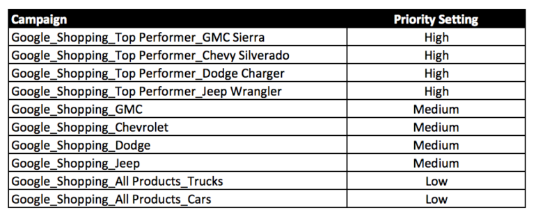 Ancora una volta, diventa particolarmente importante negli account più grandi e/o negli account con più campagne Shopping. Ad esempio, supponiamo che un account pubblicizzi più marche e modelli di veicoli (per questo esempio, ignora il fatto che i veicoli sono un articolo di alto livello e concentrati invece sull'organizzazione). Ecco come suddividerei le impostazioni di priorità per campagna.