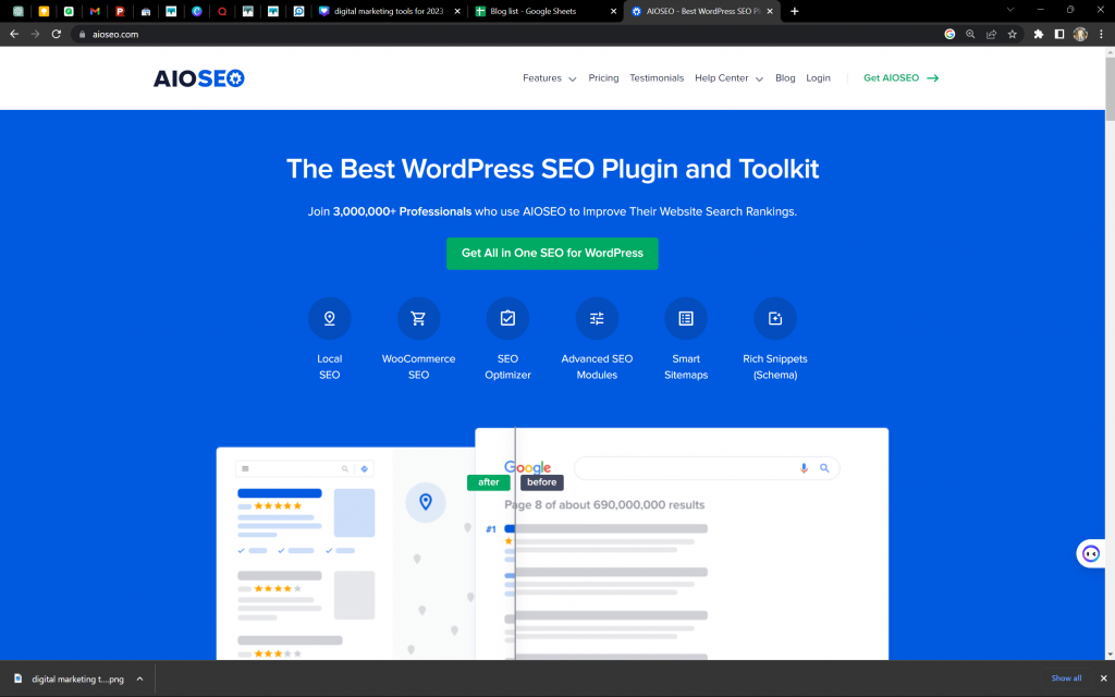 AIOSEO è un plugin WordPress ampiamente utilizzato con oltre 2 milioni di installazioni. Offre una gamma di funzionalità per ottimizzare i siti Web per i motori di ricerca.