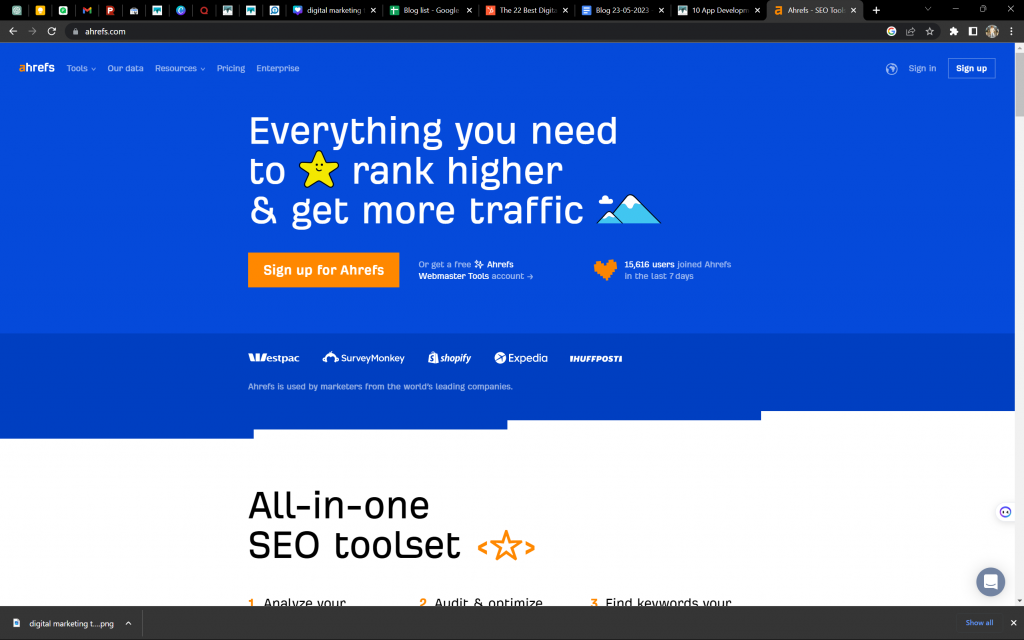 I 20 migliori strumenti di marketing digitale nel 2023 Ahrefs SEO tutto in uno Brafton Omnisend Hub di prova PointerPro Yoast Allentato Trello Google AdWords statistiche di Google Whatagraph Alce MailChimp Asana BuzzSumo Incontra Edgar Respingente Hootsuite Pixpa |