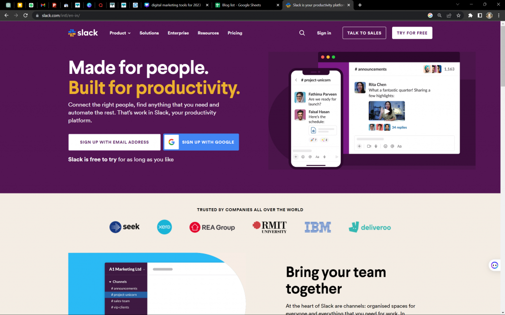 Le piccole e medie imprese possono beneficiare di piani gratuiti, mentre le imprese possono optare per prezzi personalizzati. Con la sua interfaccia intuitiva e le funzionalità di comunicazione semplificate, Slack è ampiamente considerata la scelta migliore per una collaborazione e un networking efficienti, in particolare nel regno del marketing digitale.