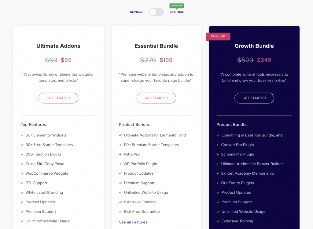 Pacchetto di crescita : include Ultimate Addons per Elementor e tutti i prodotti premium Brainstorm Force. È perfetto per aziende e proprietari di agenzie. Growth Bundle è una suite completa di strumenti per costruire e far crescere la tua attività online.
