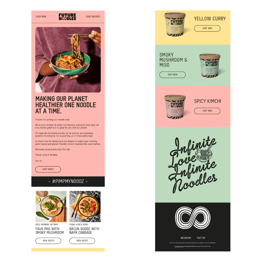 In questa e-mail di benvenuto, vieni accolto con una ciotola di noodles, con la didascalia "Rendere il nostro pianeta più sano, un noodle alla volta". Simile a GOOD Meat, Future Noodles utilizza un approccio basato sulla trama per darti il benvenuto nel club, consigliando al contempo i suoi bestseller.