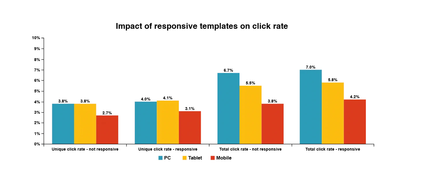 Secondo una ricerca di Mailchimp, i design reattivi ottengono percentuali di clic più elevate su tutti i dispositivi, ma ancora di più (aumento del 15%) sui dispositivi mobili.