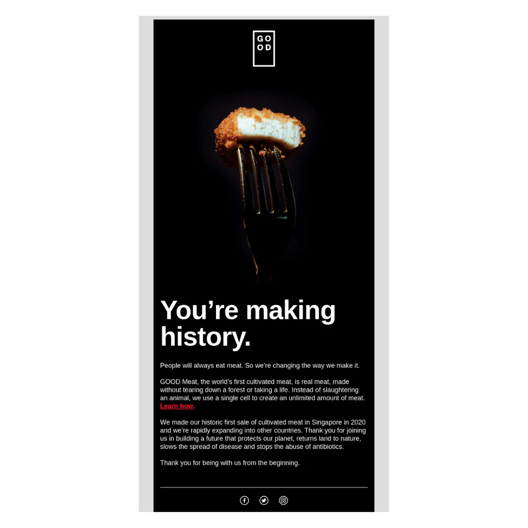 Per questa email di benvenuto, vieni accolto da un pollo su una forchetta con le parole in grassetto "Stai facendo la storia". Questa e-mail riguarda principalmente il racconto della storia di GOOD Meat e assicurarti di rimanere aggiornato per e-mail future di follow-up.