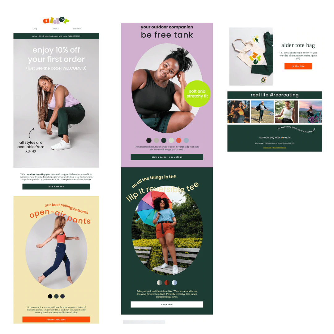 Un'altra attività di e-commerce di abbigliamento con un'e-mail di benvenuto eccezionale è Alder, un'azienda di abbigliamento femminile per attività ricreative all'aperto.