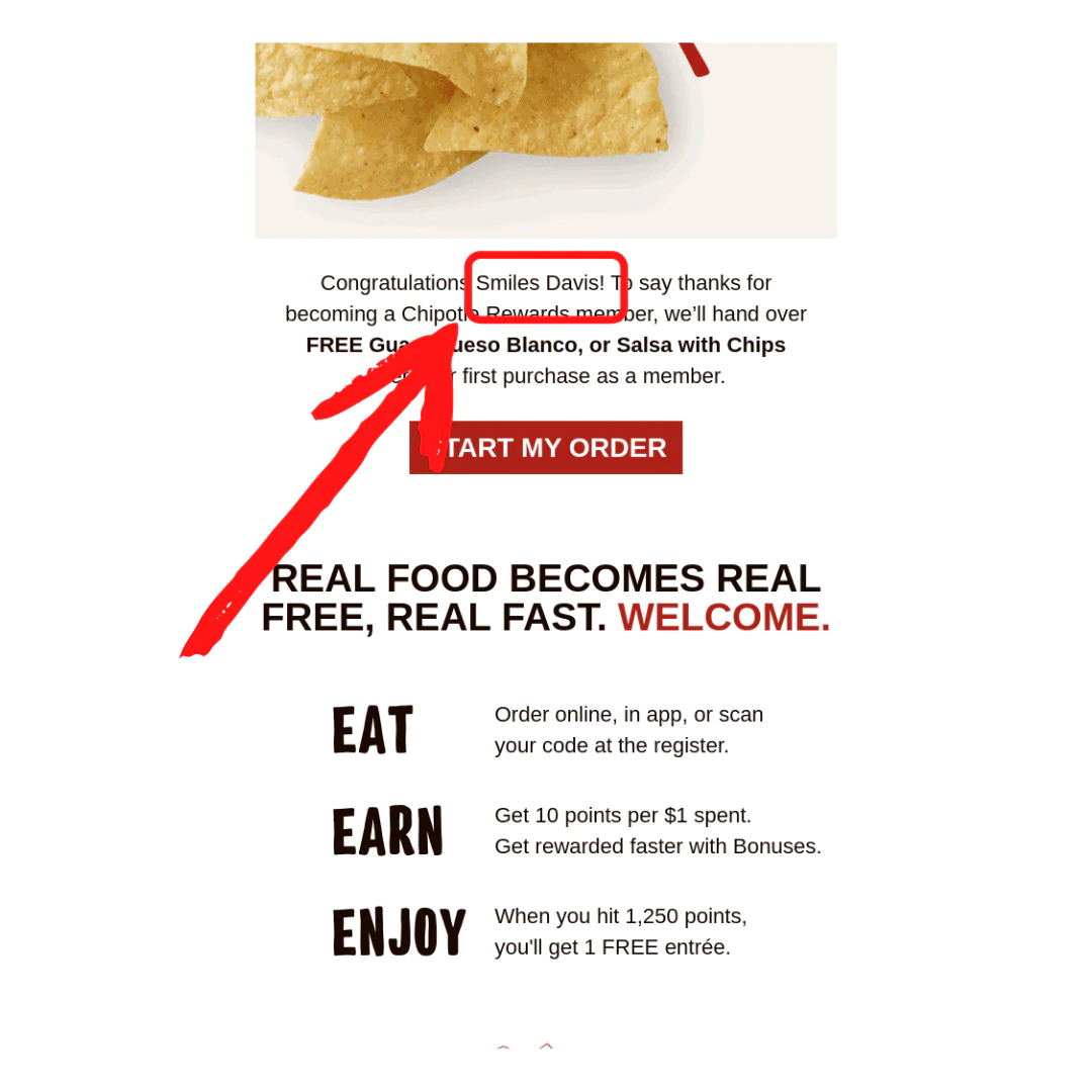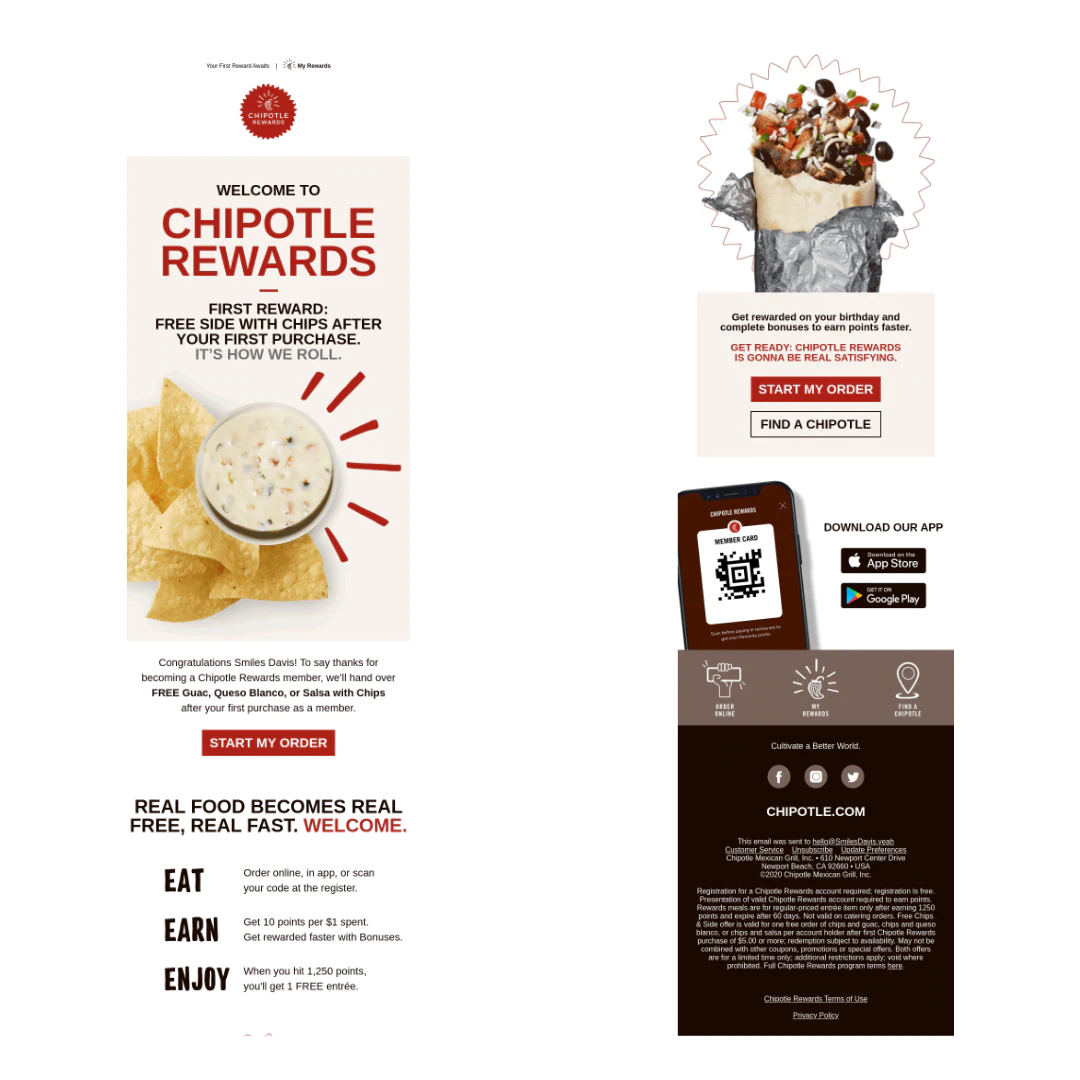 L'e-mail di cui sopra ti dà il benvenuto nel programma Chipotle Rewards. Ti mostra subito cosa ha da offrire e i vantaggi che ottieni essendo un cliente fedele. Hai anche gli stessi pulsanti CTA che scorrono attraverso l'e-mail (ordina cibo). Infine, rende l'e-mail personale indirizzando i clienti per nome e raccontando loro i premi di compleanno.