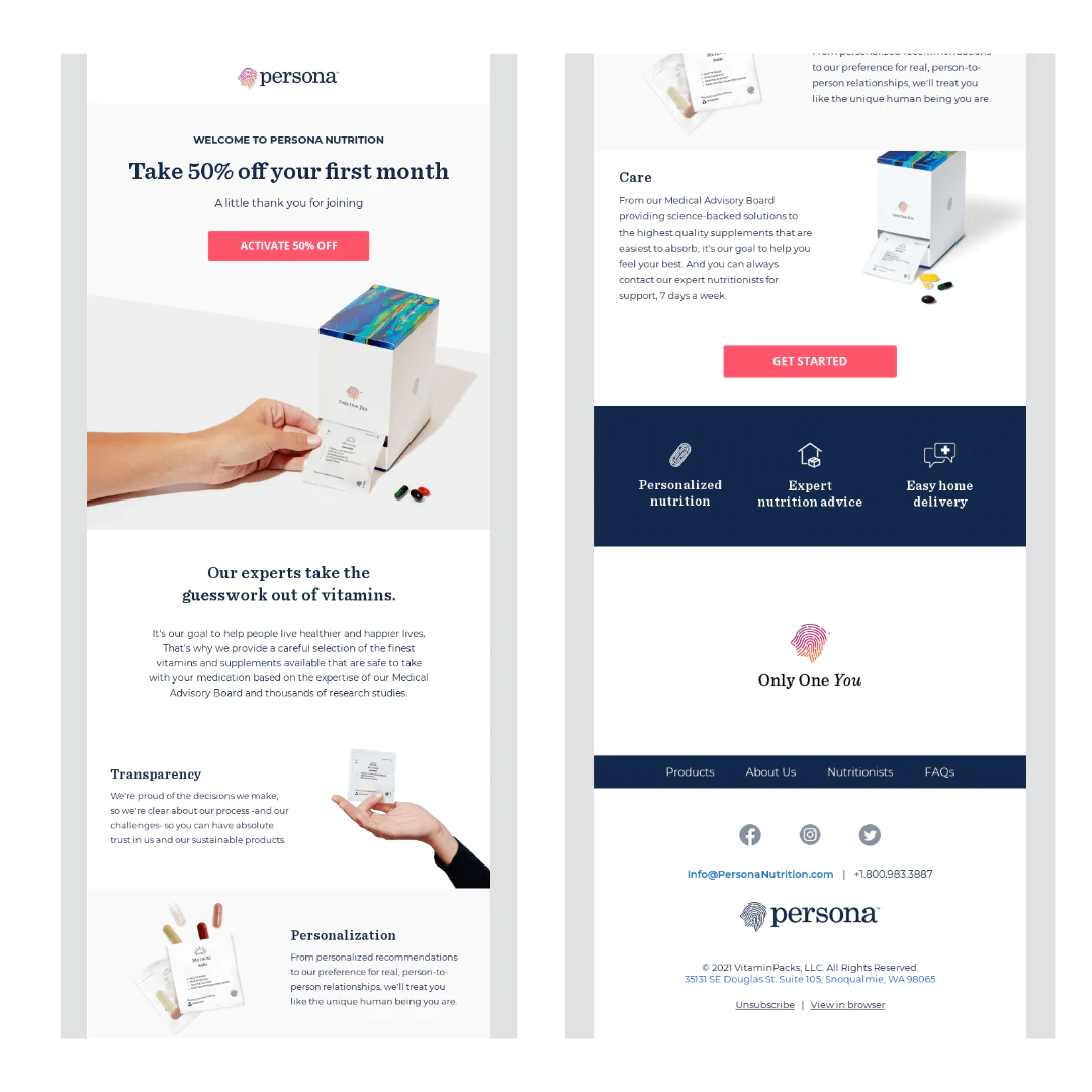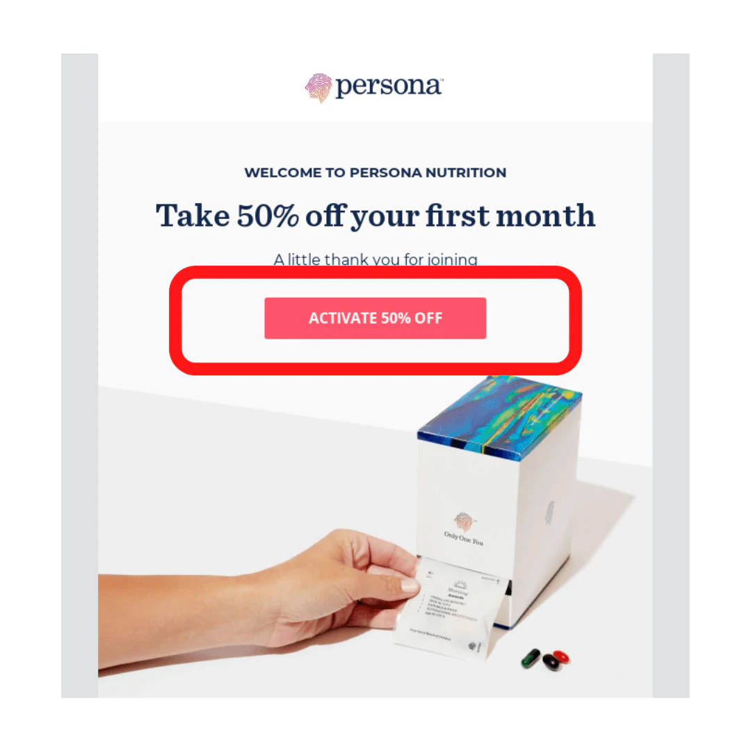 Nella sua email di benvenuto ricevi anche un grande sconto sul tuo primo mese, portandoti a un CTA molto chiaro (attiva il 50% di sconto). Dopo l'intestazione, il contenuto dell'e-mail ti guida attraverso alcuni dei valori fondamentali di Persona e come è all'altezza di essi.