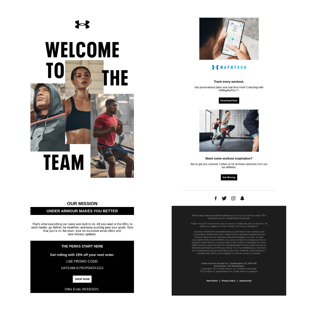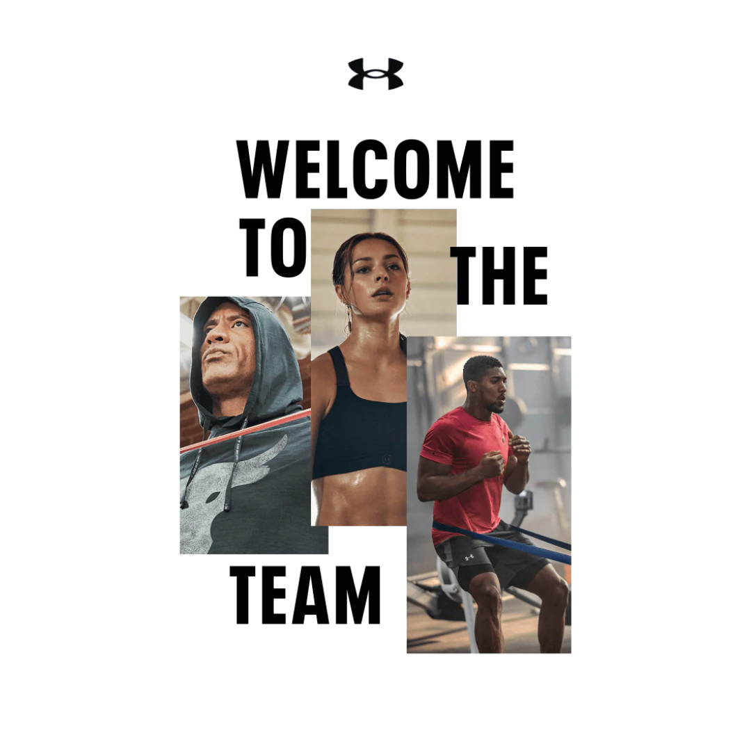 Se ti piace lo sport, è probabile che tu abbia sentito parlare di Under Armour, il marchio di abbigliamento e attrezzatura sportiva. Il design dell'e-mail di benvenuto che vedrai di seguito riflette molto i potenziali clienti che il marchio vuole attirare.