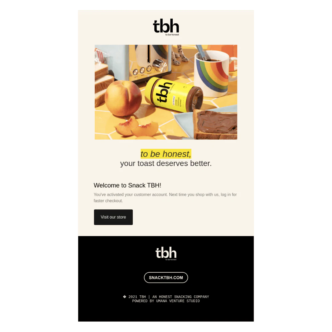 L'ultimo esempio di email di benvenuto che abbiamo per te è di Snack TBH. Questa azienda ha un solo prodotto ed è al centro delle sue campagne e-mail.
