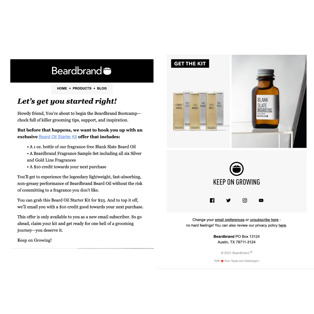 In questa e-mail di benvenuto, Beardbrand offre uno speciale pacchetto di prodotti per far sentire i suoi abbonati come se si stessero unendo a un gruppo esclusivo. Sebbene l'e-mail includa piccoli collegamenti alla sua home page, blog e pagina dei prodotti, l'e-mail ha un chiaro obiettivo di convincere il cliente ad acquistare il pacchetto iniziale.