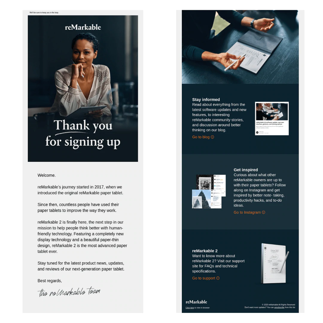 Nella sua e-mail di benvenuto, notevole prima ti fornisce un background sull'azienda, quindi passa senza problemi alle informazioni sul suo ultimo prodotto (reMarkable 2). L'e-mail ha quindi un taglio netto per aiutare il lettore a scoprire di più sull'azienda e sui prodotti tramite collegamenti diversi.