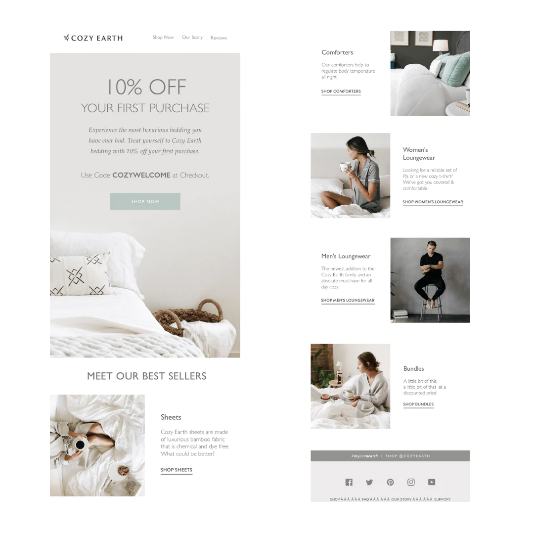 Nella sua e-mail di benvenuto, ricevi subito un codice sconto per il tuo primo acquisto, con un invito all'azione del pulsante Shop (CTA). Sotto il coupon, Cosy Earth mostra diverse categorie di acquisti più vendute per farti ottenere ciò che potresti desiderare più velocemente.