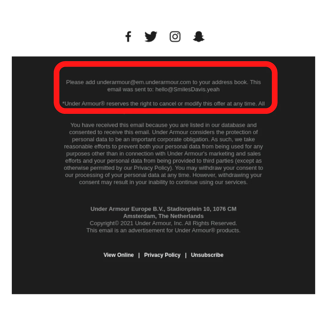 Uno degli esempi che abbiamo visto in precedenza, Under Armour, fa questo, ma solo nella stampa fine in fondo all'e-mail.