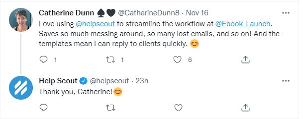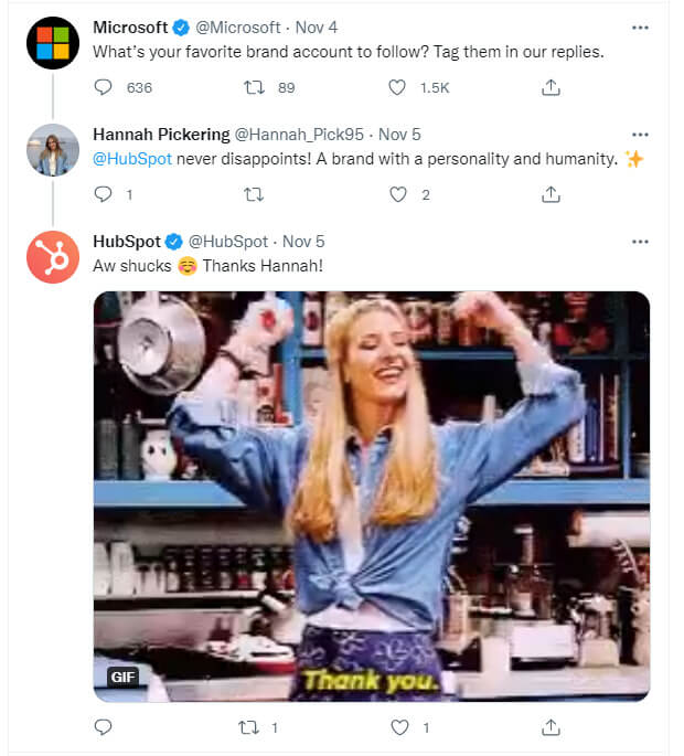 In questo esempio, HubSpot si impegna con lodi e feedback che riceve, rafforzando le relazioni con i clienti: