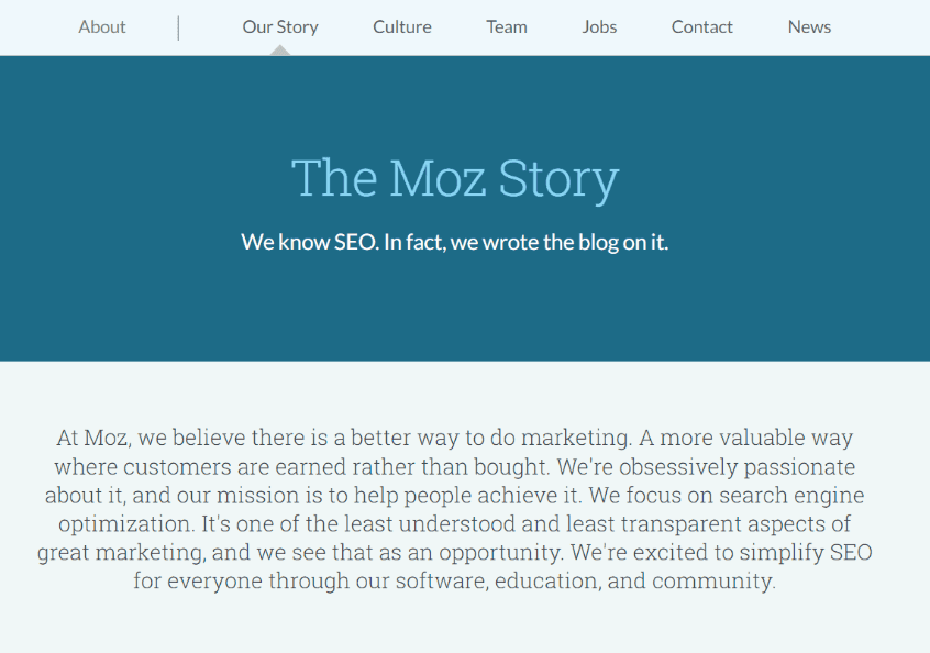 Fonte Inoltre, la pagina Chi siamo su Moz ha intestazioni chiare, brevi blurb e alcune immagini per aiutare a suddividere il testo. Moz è trasparente sui suoi umili inizi, su come ha ricevuto finanziamenti e, soprattutto, su come è passato ai valori fondamentali dell'azienda di ciò che sa fare meglio: la ricerca.Cotopassi