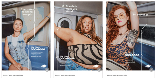 今年もダヴは#FreeThePitsキャンペーンを立ち上げ、ポジティブなボディイメージを構築するという使命を継続した。これは女性がわきの下の固定観念を拒否し、あらゆる形のわきの下を受け入れるよう奨励する一連の取り組みである。 ダヴはニューヨーク市の地下鉄に広告を掲載し、その後、ファッションウィーク中にダヴの「ピットストップ」ポップアップショップを運営し、わきがを祝うとともに、ダヴのデオドラントを含むピットキットや無料のメトロカード、その他女性が自信を持つのに役立つアイテムをプレゼントした。